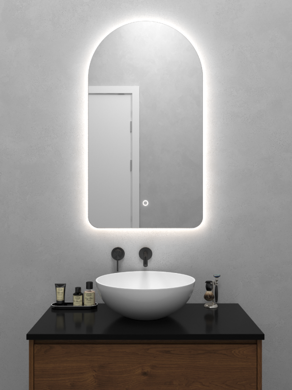 Безрамное зеркало арочной формы с контурной (тыльной) нейтральной подсветкой, свет 4000К. Подложка из высококачественного МДФ, светодиодная лента защищена матовым свето-рассеивателем от попадания пыли и влаги. Есть вывод 220W для подключения к сети, включение подсветки от сенсорной кнопки на зеркале.